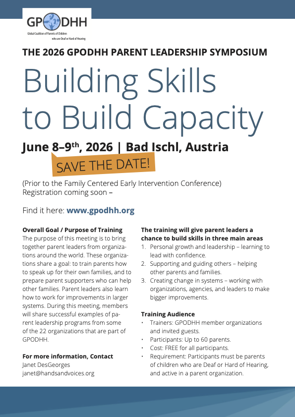 GPODHH is excited to announce our first GPODHH Leadership Symposium where parent leaders from around the world will gather to build leadership skills and capacity.